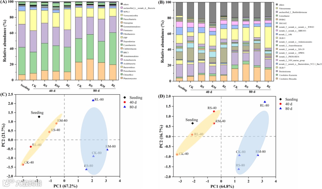 微生物群落组成在(A) 门水平和(B) 属水平的分布,以及微生物群落的主成分分析(PCA)图在(C) 门水平和(D) 属水平的分布。
