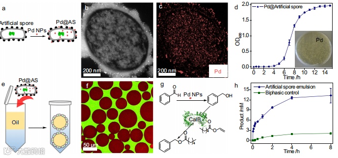 h) 在人工孢子乳液(蓝色)和双相对照(绿色)中的ADH-a催化反应曲线。