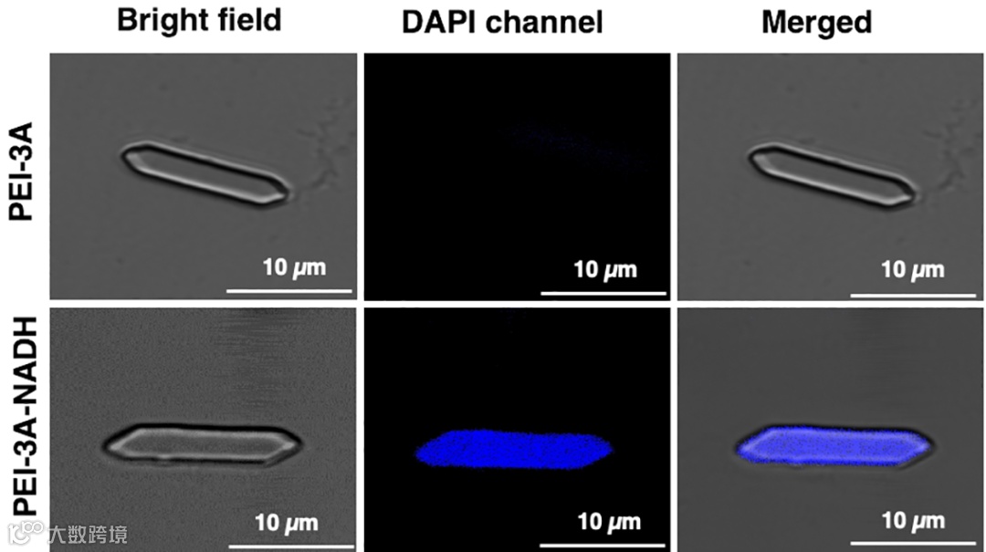 图2|体外培养的PEI-3A晶体,在有无NADH存在下的共聚焦图像