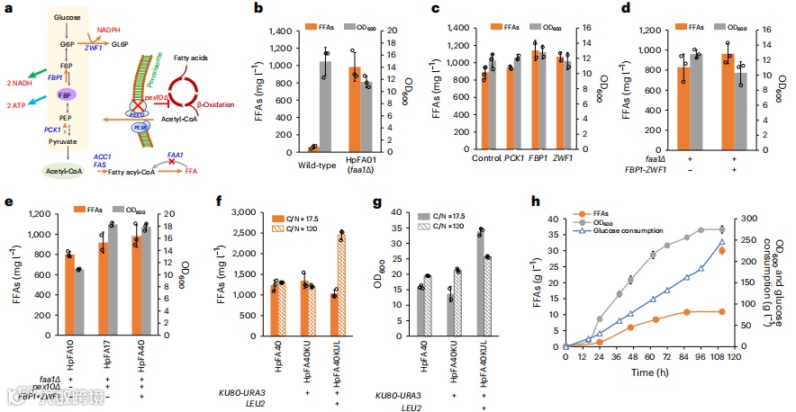 a,通过过表达FBP1和PCK1基因加强糖异生作用,增加了代谢通量至PPP,随后通过过表达的ZWF1基因促进了NADPH供应。破坏pex10基因修改了β-氧化和过氧化物酶体生物合成,增加了用于FFA生产的乙酰辅酶A供应。