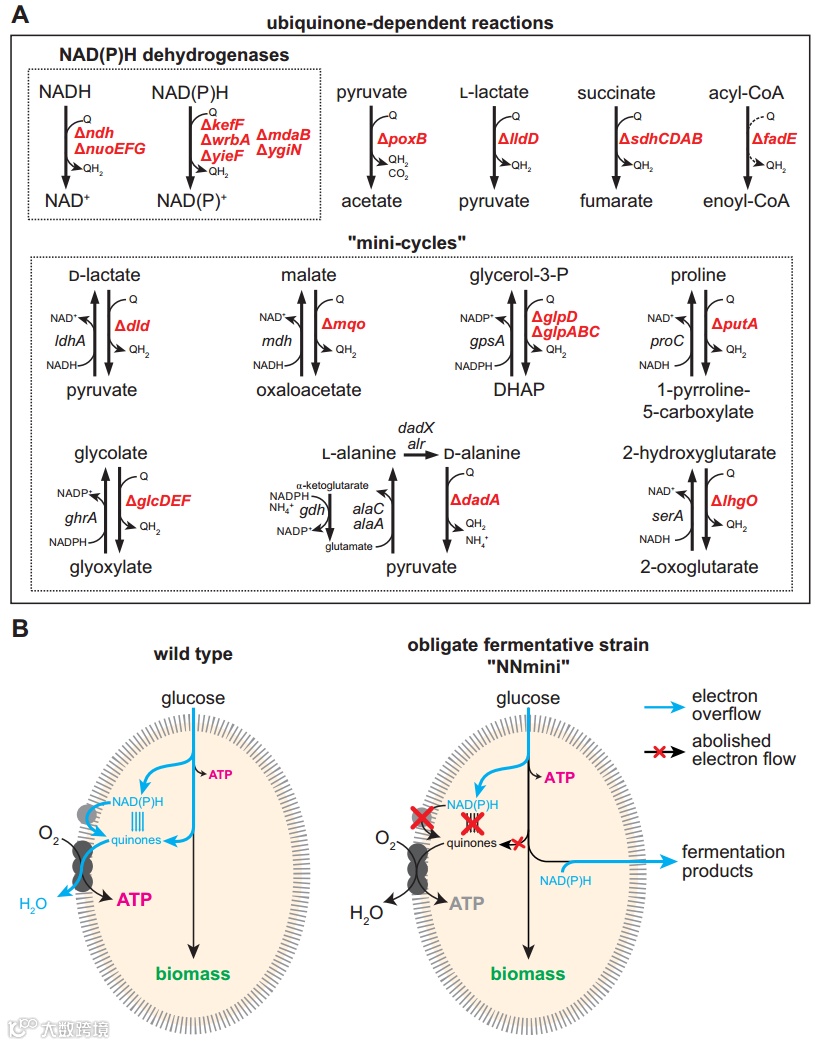 B 野生型(左侧)和好氧发酵 NNmini 菌株(右侧)细胞呼吸期间电子通量(蓝色箭头)的示意图。由于所有允许从还原当量到辅酶的电子传递的反应都被破坏(由红色十字表示),菌株依赖于发酵产物的分泌来维持氧化还原平衡。