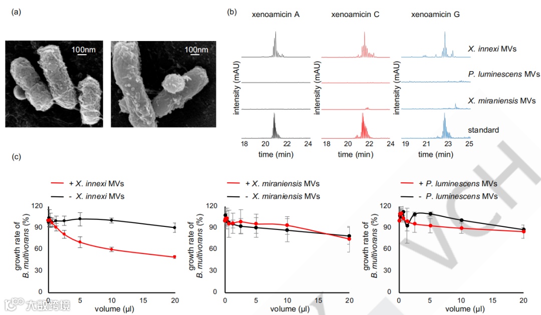 代谢分析表明,B. multivorans的MVs是通过抑制群体感应来激活Xenorhabdus innexi的BGCs的表达。同时,X. innexi的MVs通过携带特异性肽可抑制B. multivorans的生长,表明B. multivorans和X. innexi间通过MVs进行了种间通讯。