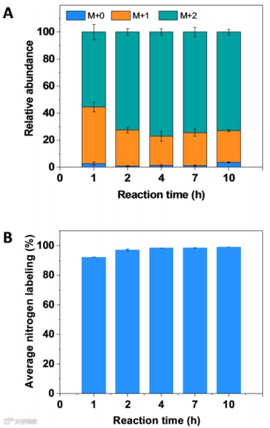 (b)以15NH4Cl为底物,合成甘氨酸时15N的相对丰度。