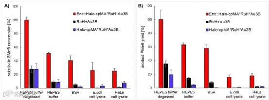 图中RuH:带有HaloTag配体的钌催化剂;Au3B:带有亲和素配体的金催化剂。