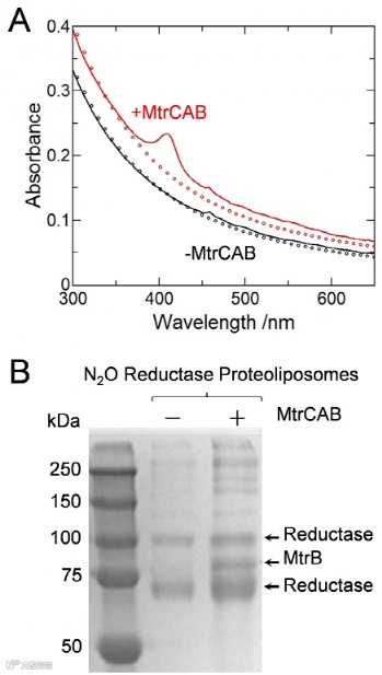 在这里,作者利用了石墨掺杂碳点、MtrCAB蛋白复合物和N2O还原酶组装了脂质体微反应器,在光照下,石墨掺杂碳点产生电子,电子经MtrCAB蛋白复合物转移给N2O还原酶,可将N2O还原为气候中性产物N2。在微反应器中,电子从MtrCAB到N2O还原酶是由甲基紫晶进行介导的。