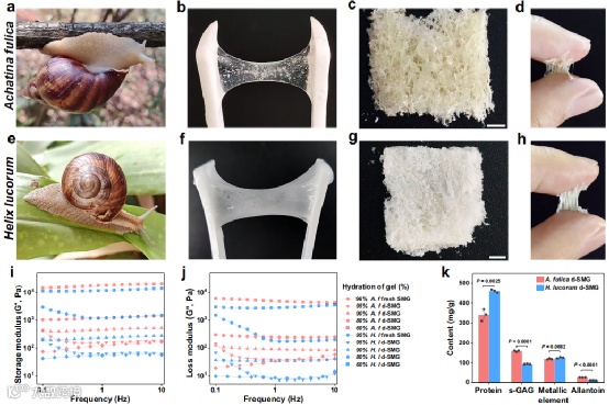 i-j A. fulica和H. lucorum的蜗牛粘液凝胶在不同水化程度下的储存模量(i)和损耗模量(j)。