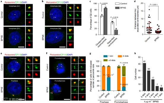 f、g,HeLa细胞通过胸腺嘧啶同步,释放并在BP(4 μg/mL)存在下用指定化合物处理8小时,并进行中心蛋白染色。