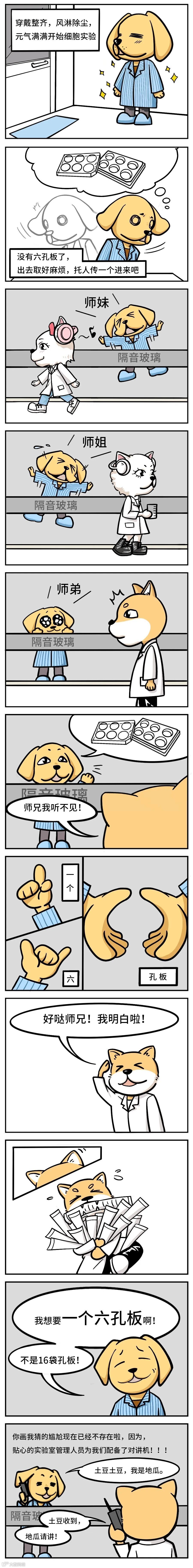 本文为原创专题“科研狗”的日常之《实验室作死行为》。描述了师兄穿好鞋套,换好实验服,风淋室吹风后进入细胞房,在细胞房耗材柜找了好几圈发现没有六孔板,觉得出去取又太麻烦之后,决定在隔音玻璃前呼叫路过的同门帮忙递一下,然而只有师弟注意到了师兄,但是师弟理解错师兄的意思拿了十六袋孔板过来。(本漫画已做优化处理,进入实验室请不要佩戴耳机哦~)