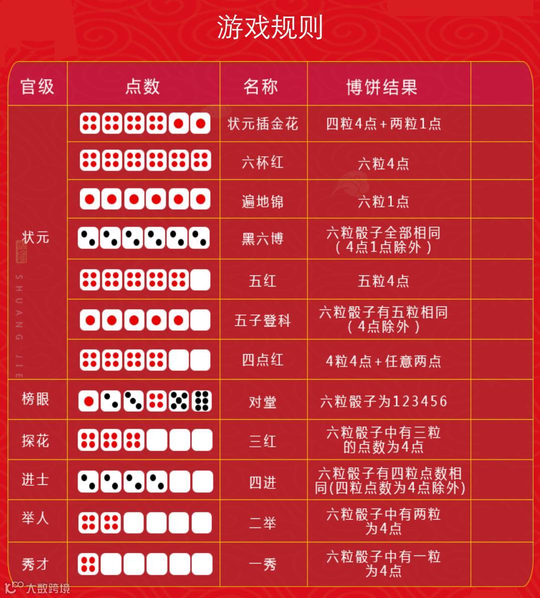 其中状元又按“状元插金花”“六勃红”“六勃黑”“五王”“五子”“四子”从大到小排列。