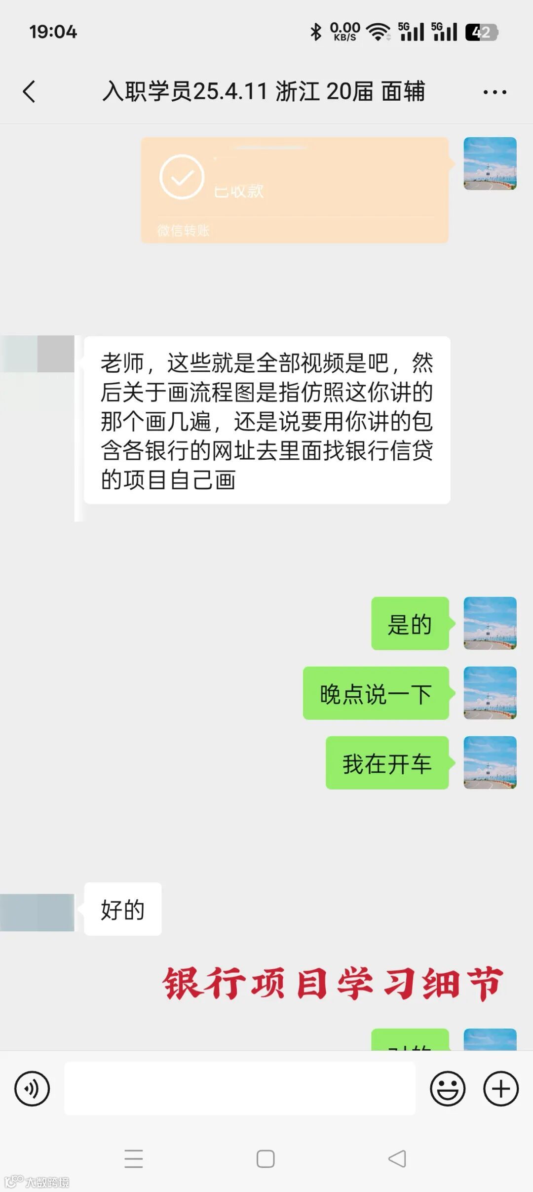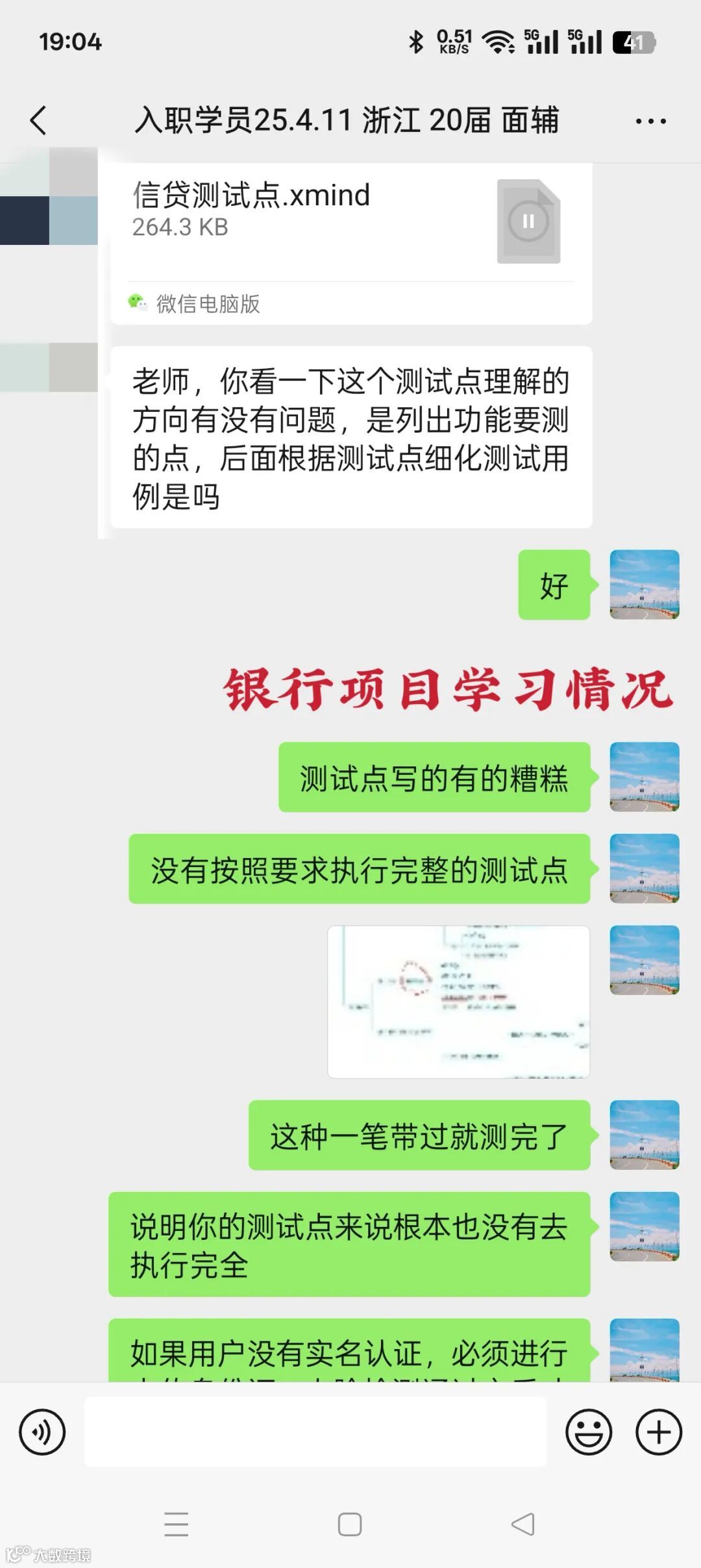 学习中,周同学态度格外认真。绘制业务流程图、梳理测试点,每一项任务都细致完成;遇到业务难题,他第一时间提问,老师则通过腾讯会议一对一辅导,逐点对齐银行项目细节,耐心解答直到他彻底学透。正是这种 “从零起步、逐个突破” 的过程,让周同学逐步构建起银行测试知识体系,一点点填补了银行项目经验的空白。