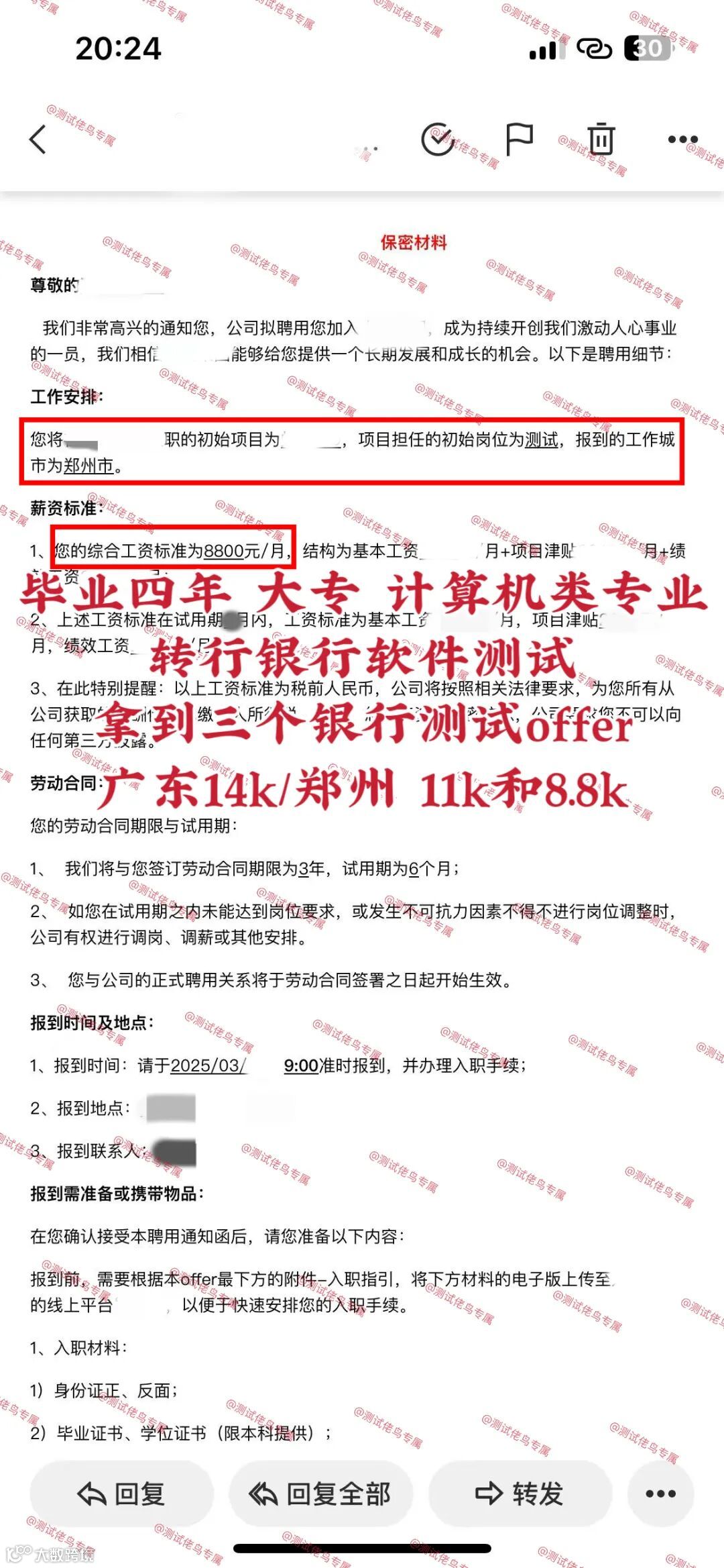项目学习结束后,老师还针对邱同学的情况进行了简历优化,突出其银行项目学习成果与测试能力。当他将优化后的简历投向市场后,很快收到了多家银行的面试邀请。凭借扎实的项目知识储备与出色的面试表现,邱同学最终成功拿下三家银行的测试offer—— 广东某银行月薪14k、郑州某银行月薪11k,另有郑州一家银行给出8.8k的薪资。