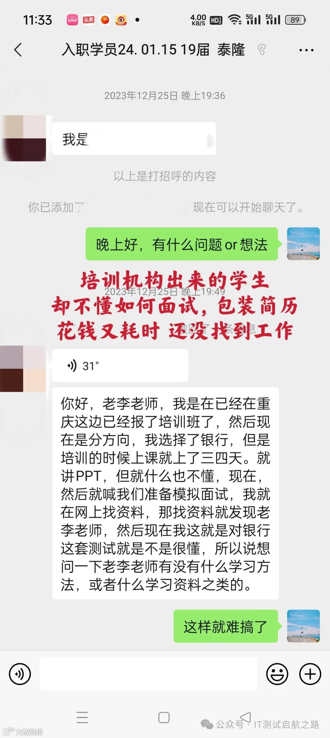 小毅同学,一名19届土木工程专业的毕业生,对IT有着浓厚的兴趣。然而,零基础没有任何经验的他,学习软件测试遇到困难。于是,他在重庆参加了软件测试某机构培训班,希望能在这个热门领域中找到工作。可是,他花费了两万多的费用,培训完之后却完全不懂如何面试,对简历的包装也是不知如何下手。失落之余,小毅同学并未放弃。偶然的机会,他通过网络平台一些银行项目视频,了解到测试佬鸟老师对银行测试项目的专业性,立即意识到这可能是他转行成功的关键。