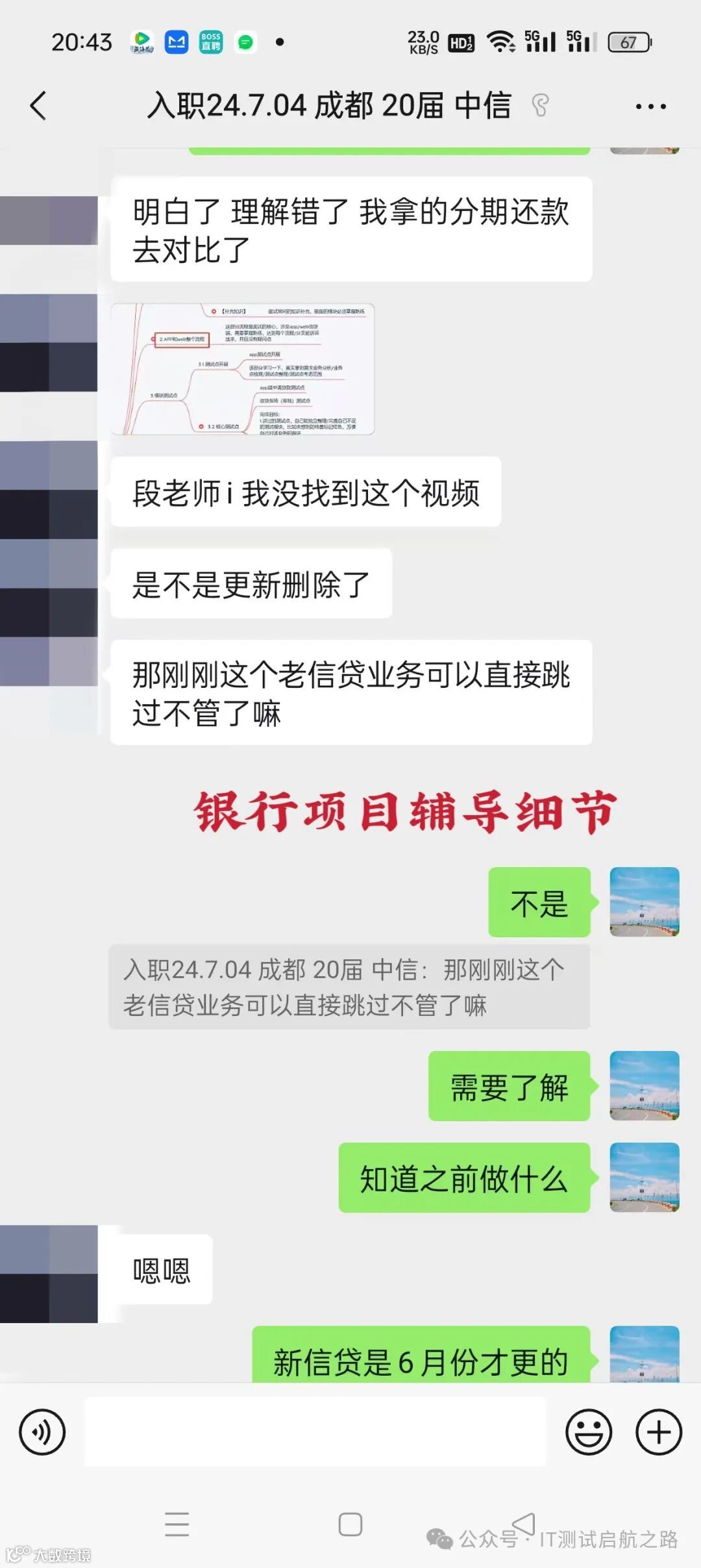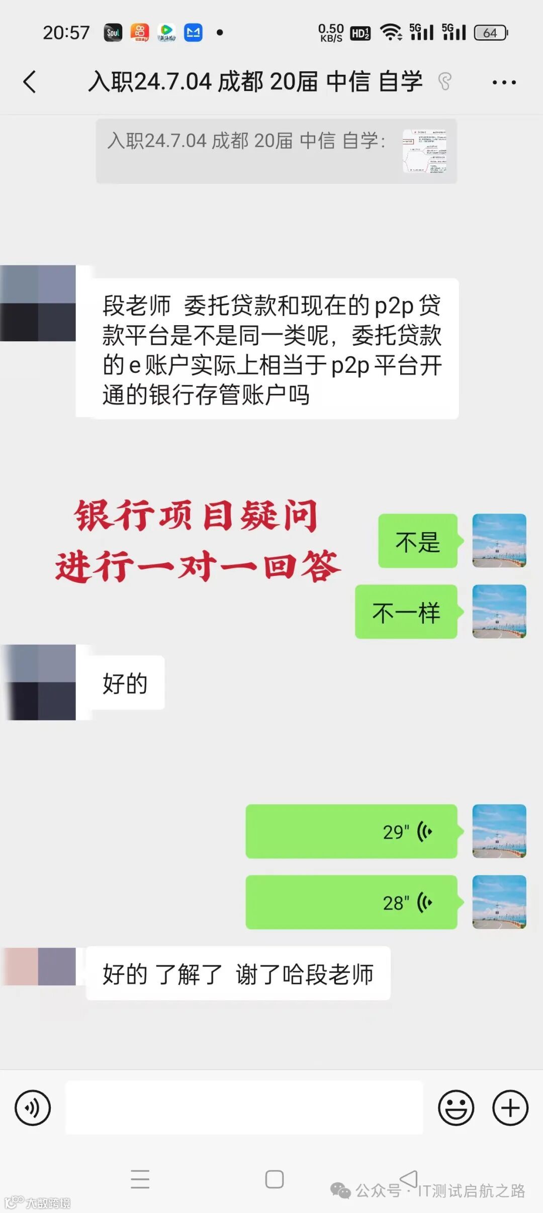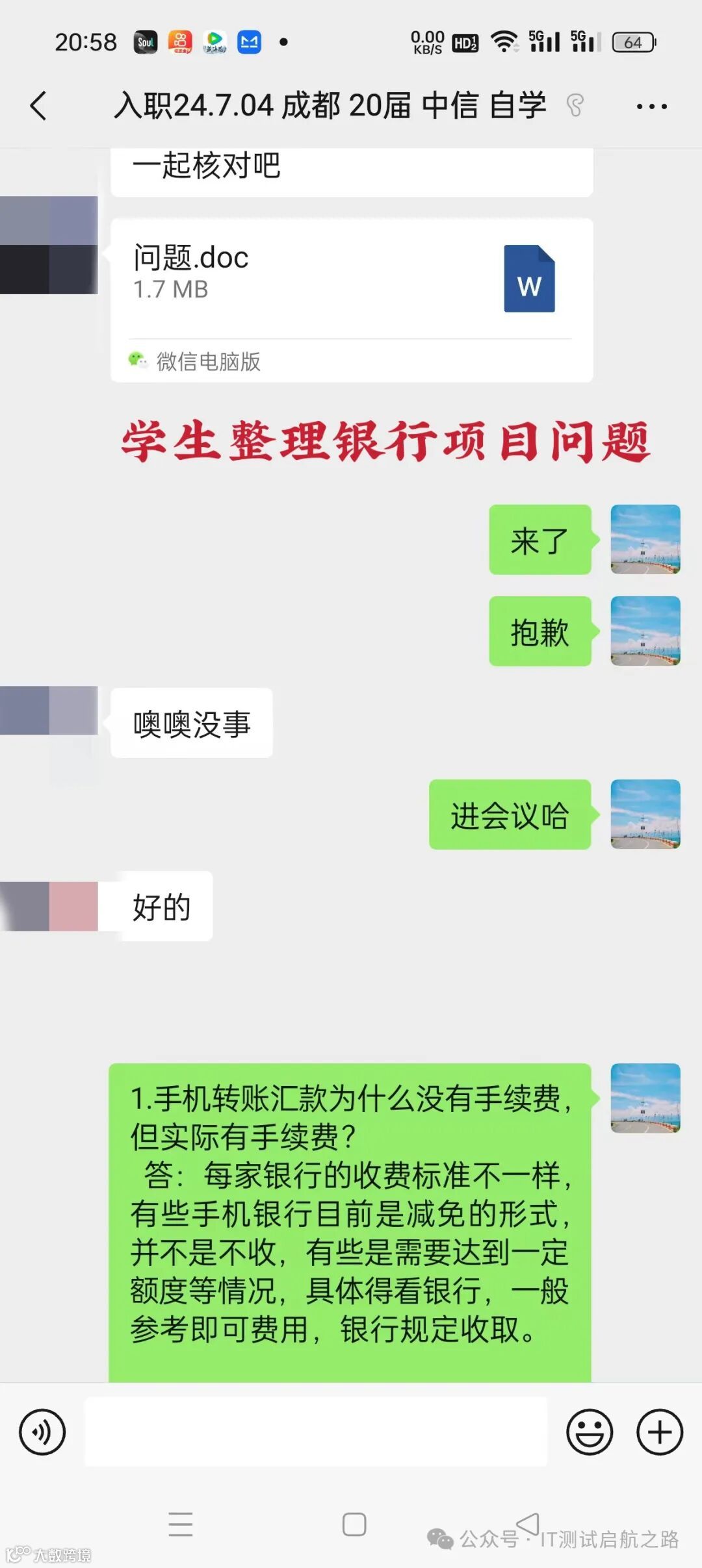 董同学加入项目后,第一步便是对自己的技能栈进行全面整理并输出。老师根据他的技能情况,给出了切实可行的建议,为他的提升之路指明了方向。在学习过程中,董同学积极投入,认真完成每一项银行业务任务。他精心绘制业务流程图,仔细分析测试点,深入探索接口场景,力求对银行业务有更深入的理解。老师则通过腾讯会议与董同学进行一对一交流,细致地对齐银行项目细节,确保他准确掌握每一个关键环节。董同学在学习中不时对银行业务知识提出疑问,而老师总是以极大的耐心认真答疑,帮助他消除知识盲点。最后,老师还对董同学的银行简历进行了细致入微的优化。