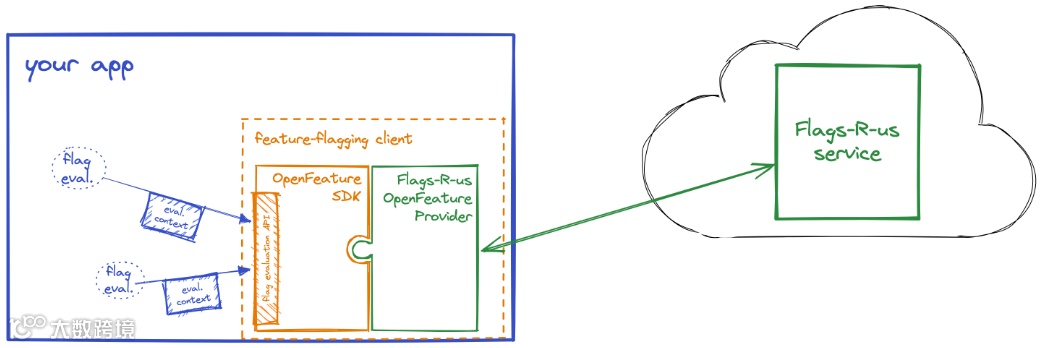 此图展现了,OpenFeature与"Flags-R-us"旗帜管理系统集成。