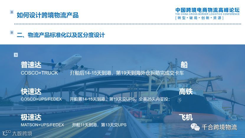 说到标准化,我们以极速达为例子,美森的船周日到港,周一可提柜子,但是市场上大家基本美国周三是正常,周四,周五交UPS的也大有人在,为什么,代理的配合度不一样,我们给海外的要求是,美国时间周二交UPS,我们可以额外付USD 300操作费,这样可以确保我们的时效最长,最远的区域,不超过20个自然日,电商客户选择我们的时候,就以为着这是一个稳定的供应链,他们可以很好的规划自己的产品采购和供应。