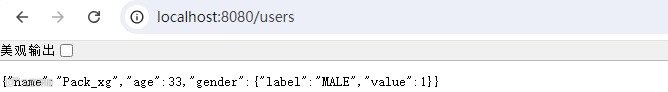 ("/users")public class UserController {public ResponseEntity<User> query() {return ResponseEntity.ok(new User("Pack_xg", 33, Gender.MALE)) ;}}