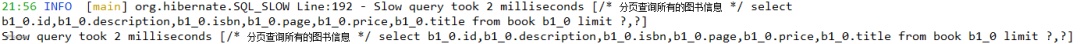 21:04 DEBUG [main] org.hibernate.SQL Line:135 -selectb1_0.id,b1_0.description,b1_0.isbn,b1_0.page,b1_0.price,b1_0.titlefrombook b1_0limit?, ?