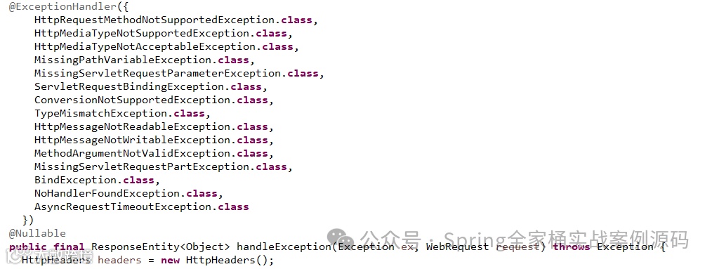 很多时候我们都会自定义自己的@RestControllerAdvice类,在该类中定义使用@ExceptionHandler注解的方法进行全局的异常拦截统一处理。这种方式应该是最简单最有效的处理方式了。其实在SpringWeb中提供了一个ResponseEntityExceptionHandler类,该类是个抽象类,该类定义了@ExceptionHandler方法,该异常处理句柄能够处理常见的一些异常,我们可以基础该类,针对这些不同的异常进行特殊的处理。