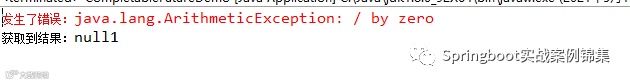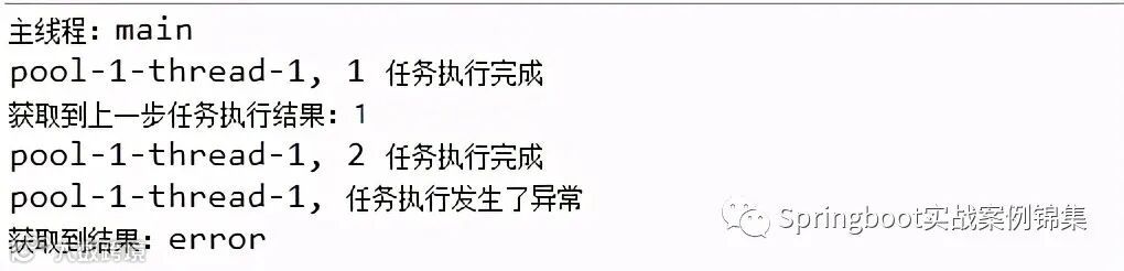 CompletableFuture.supplyAsync(() -> {try {TimeUnit.SECONDS.sleep(3) ;System.out.println(Thread.currentThread().getName() + ", 1 任务执行完成") ;} catch (InterruptedException e) {e.printStackTrace();}return "1" ;}, executor).thenApply(res -> {System.out.println("获取到上一步任务执行结果:" + res) ;try {TimeUnit.SECONDS.sleep(2) ;System.out.println(Thread.currentThread().getName() + ", 2 任务执行完成") ;System.out.println(1 / 0) ;} catch (InterruptedException e) {e.printStackTrace();}return "2" ;}).exceptionally(tx -> {System.out.println(Thread.currentThread().getName() + ", 任务执行发生了异常") ;return "error" ;}).whenComplete((res, tx) -> {System.out.println("获取到结果:" + res) ;if (tx != null) {System.err.println("发生错误了:" + tx.getMessage()) ;}executor.shutdown();}) ;System.out.println("主线程:" + Thread.currentThread().getName()) ;
