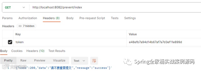 public class PreventDuplicateAspect {public static final String PREVENT_PREFIX_KEY = "prevent:" ;private final StringRedisTemplate stringRedisTemplate ;private final HttpServletRequest request ;public PreventDuplicateAspect(StringRedisTemplate stringRedisTemplate, HttpServletRequest request) {this.stringRedisTemplate = stringRedisTemplate ;this.request = request ;}public Object preventDuplicate(ProceedingJoinPoint pjp, PreventDuplicate prevent) throws Throwable {String key = prevent.header() ;String value = null ;if (key != null && key.length() > 0) {value = this.request.getHeader(key) ;} else {key = prevent.param() ;if (key != null && key.length() > 0) {value = this.request.getParameter(key) ;}}if (value == null || "".equals(value.trim())) {return "非法请求" ;}// 拼接rediskeyString prevent_key = PREVENT_PREFIX_KEY + value ;// 判断redis中是否存在当前请求中携带的唯一标识数据, 删除成功则存在Boolean result = this.stringRedisTemplate.delete(prevent_key) ;if (result != null && result.booleanValue()) {return pjp.proceed() ;} else {return "请不要重复提交" ;}}}