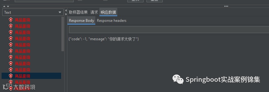 public class ProductController {private final RateLimiter rateLimiter = RateLimiter.create(5.0) ;public ResponseEntity<R> queryProducts( String id) throws Exception {if (rateLimiter.tryAcquire(1)) {TimeUnit.MILLISECONDS.sleep(200) ;return new ResponseEntity<R>(R.success("查询商品【" + id + "】成功"), HttpStatus.OK) ;}return new ResponseEntity<R>(R.failure("你访问的太快了"), HttpStatus.INTERNAL_SERVER_ERROR) ;}}