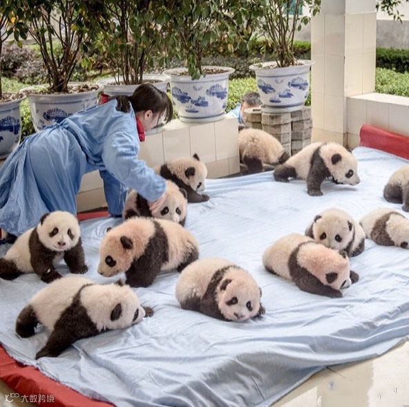 ■ 熊猫繁殖中心熊猫宝贝在毯子上翻滚,雅安,中国