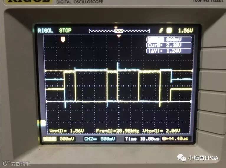 8、使用示波器测量RS485总线上的A和B端,如图9所示。其中蓝色波形为A,黄色波形为B。可以看到,第一位波形,A-B的差值为-1.24V左右,代表0,对应了UART串口协议的起始位,第二位,A-B的差值为1.24V,代表1,而实际发送的数据37h的二进制值为00110111b,bit0的值为1,刚好与波形对应。