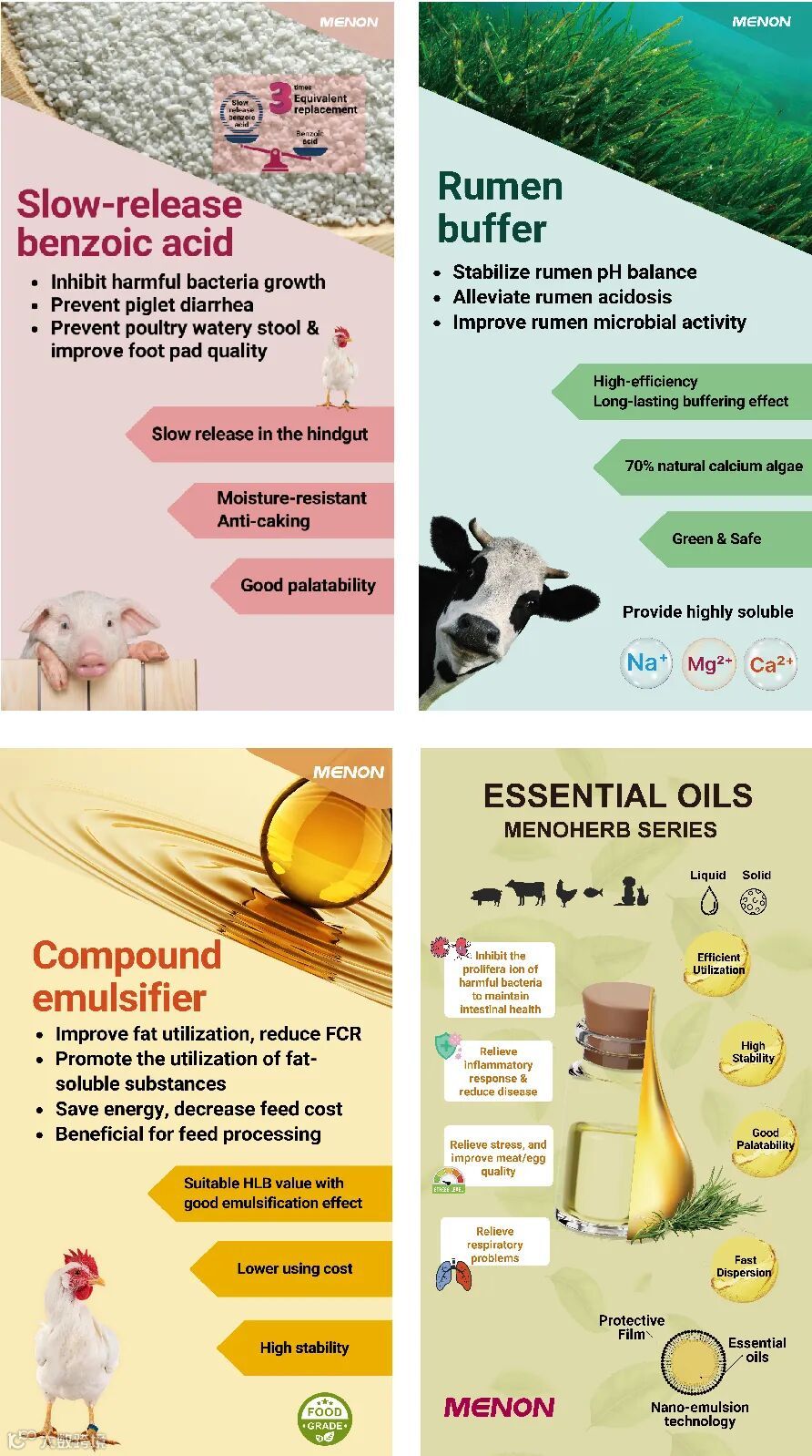 本次展会上,您将见证高效瘤胃酸度缓冲剂稳定瘤胃pH值平衡,促进瘤胃酸碱环境稳态;植物精油系列以超分子保护工艺技术为核心,高效促进动物生长;高效乳化剂实现油脂的高效利用,降低生产成本;缓释苯甲酸通过缓释技术实现长效抑菌杀菌,助力替抗养殖;美溢德优质功能蛋白提升蛋白利用率,提升畜牧水产养殖效益。这些创新产品融合精准营养科技与行业前瞻洞察,共同推动畜牧产业可持续发展。