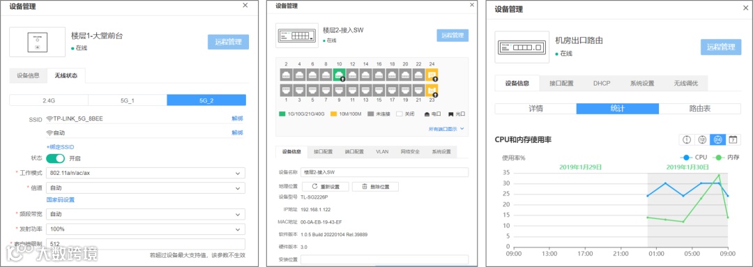可视化展示如AP无线状态信息、交换机端口信息、路由的流量/CPU统计数据等。