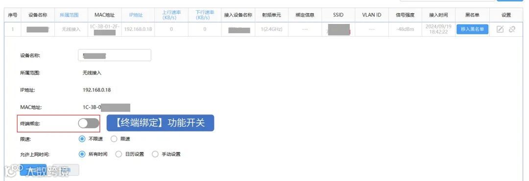 2、开启后,设置终端需绑定的AP以及频段,并可进一步配置限速和允许上网时间功能。