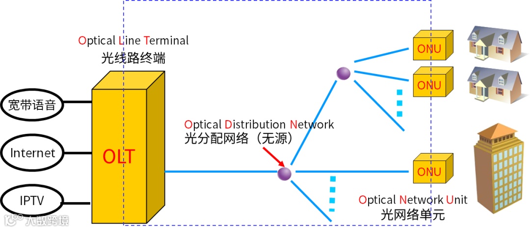 PON是Passive Optical Network(无源光网络),由光线路终端OLT(Optical Line Terminal)、光网络单元 ONU( Optical Network Unit)和光分配网络ODN(Optical Distribution Network)组成。