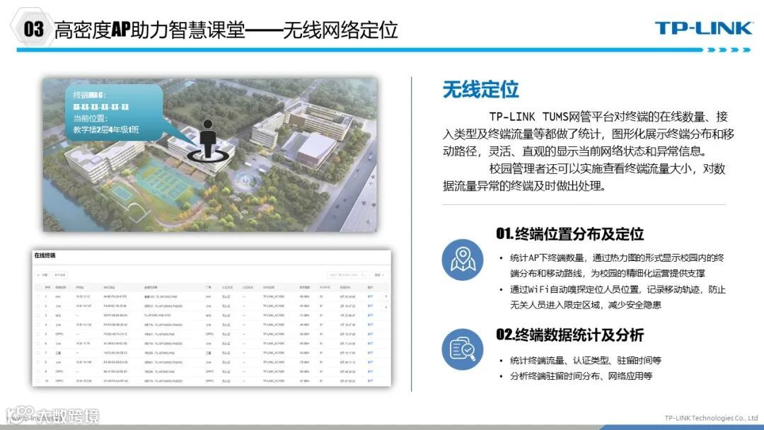 TPLINK针对传统课堂的信息化程度低、高密度下无线体验差、教师网络管理混乱的痛点针对性的提出了TP-LINK智慧课堂解决方案,拥有更全面的覆盖、更高的带机量、更精细化的管理等优势,不容错过!