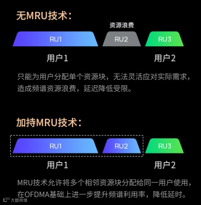 对比Wi-Fi 6技术下,每个终端只能在自己的资源块(RU)中传输无线数据;Wi-Fi 7支持MRU(Multi-Resource Unit)技术,可以将多个资源块分配给同一个终端使用,在多用户多终端使用情况下,有效提升网络使用效率,降低延时。