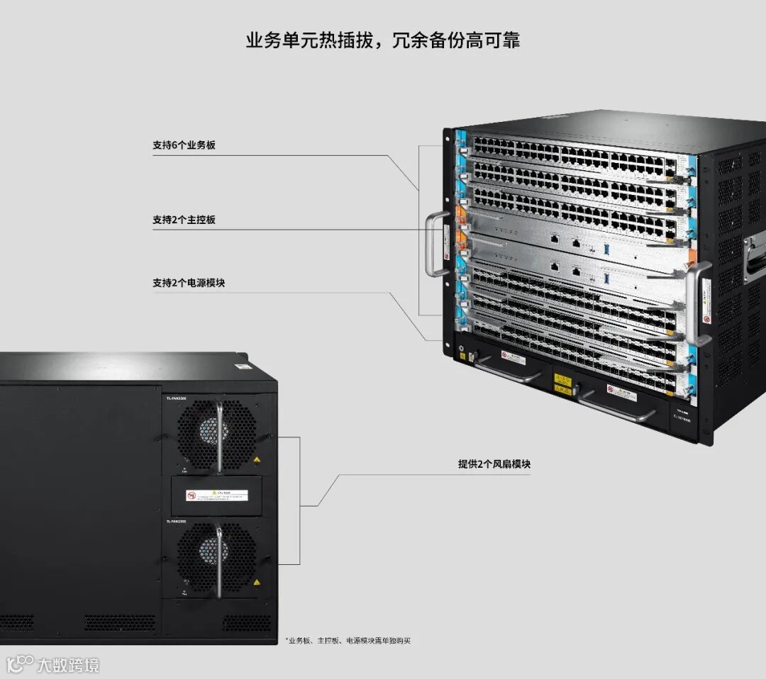 TP-LINK框式交换机按照规格和型号的不同,可以提供2-8块业务板槽位,用户可根据实际组网需求,选配不同数量和端口速率的业务板卡,可以在不影响系统正常工作的情况下,提升接入端口密度和带宽,构建弹性扩展的网络。