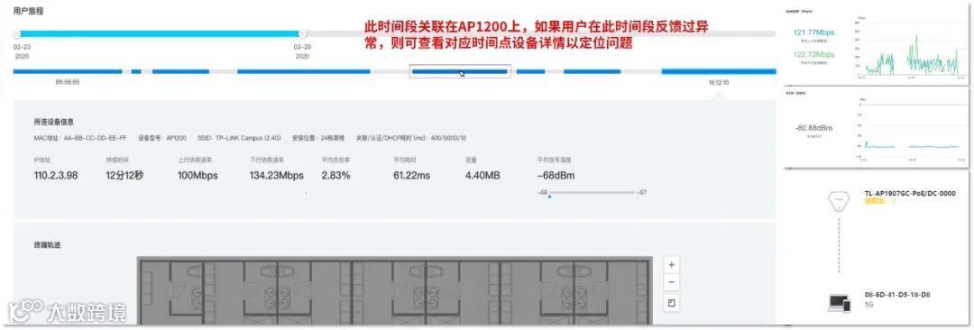 NAC S系列支持用户旅程功能,搭配后端TP-LINK TUMS网络管理平台,可以查看此终端发生关联和解关联事件的时间点、具体关联的AP设备、关联时候的无线指标质量。如果用户完成了设备布点,还可以记录终端位置变化情况。通过用户旅程功能,网络管理员可以清晰掌握每一台终端在过去一段时间内任意时间点的状态,快速追溯历史情况。