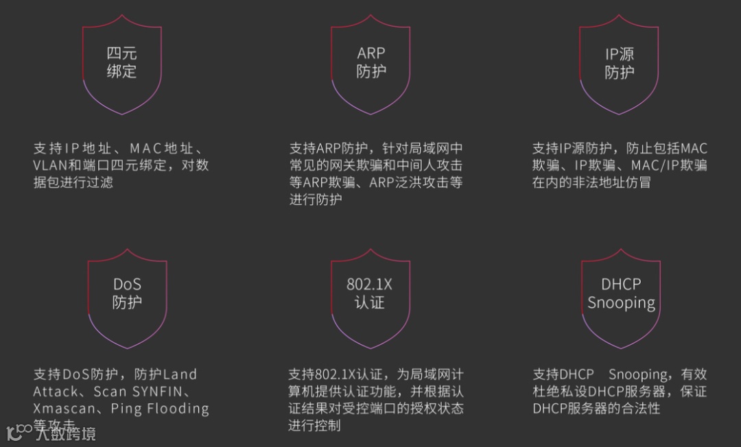 支持四元绑定、ARP防护等完善的防护机制,安全可靠。