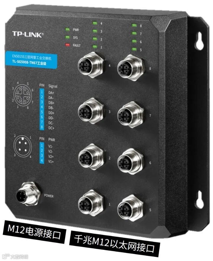 我司TL-SG5008-TN67工业级交换机携带两种类型的接口,一种是用来传输数据的8个千兆M12以太网接口(X-code,8 Pin,母头),一种是用来提供设备供电的M12电源接口(A-code,4Pin,公头)。