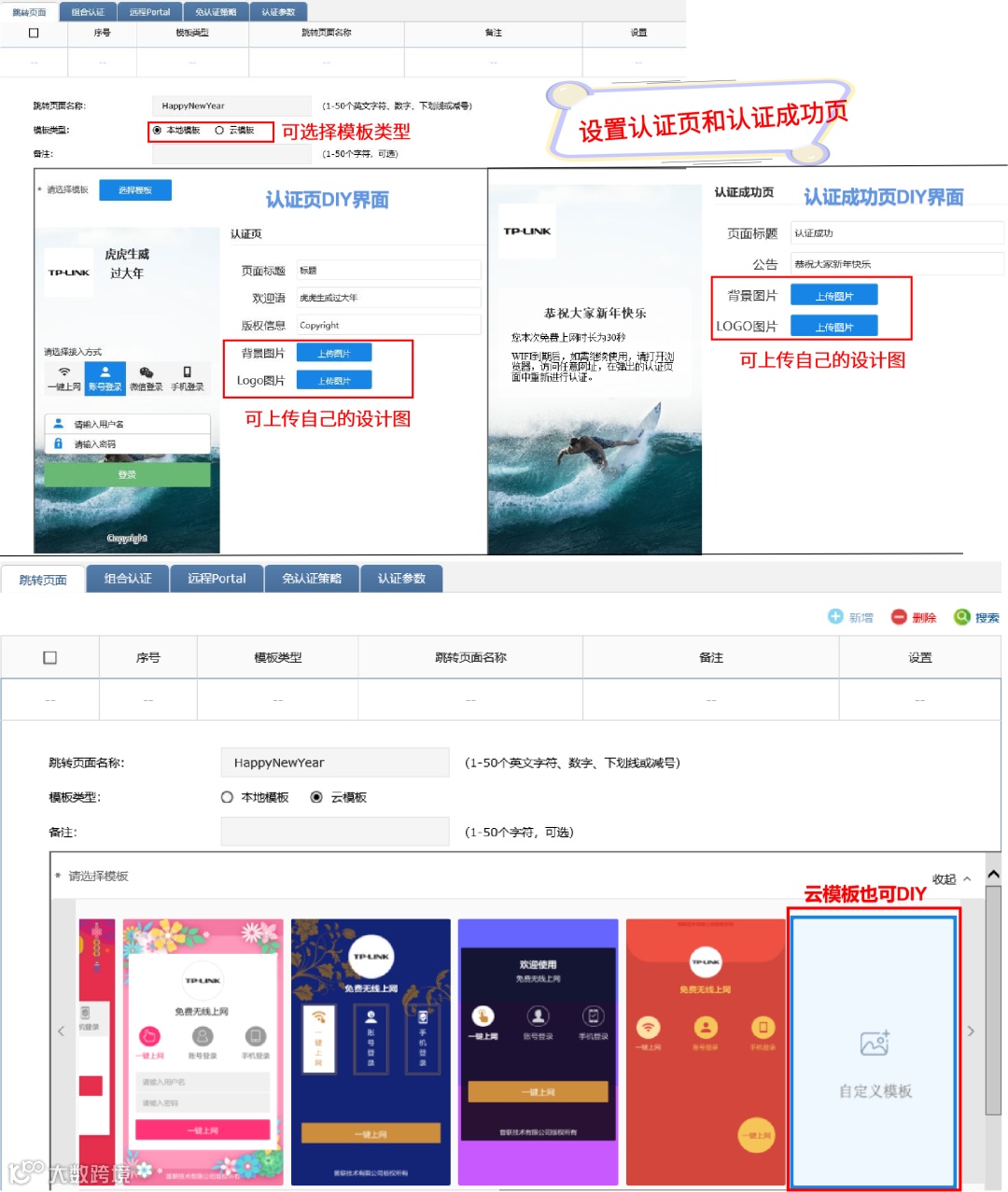 1、登录AC/路由器管理界面,点击 认证管理 >>认证设置 >> 跳转页面,设置跳转页面名称、跳转页面标题、背景图片、欢迎信息等。本地模板可以自定义上传背景图片和logo图片,云模板可自定义上传logo图片,同样支持GIF动图,让界面动起来,想怎么设计就怎么设计!