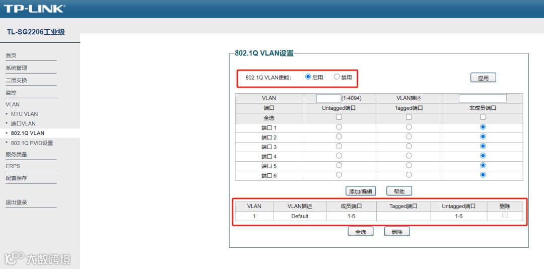 依次点击→<802.1Q VLAN>,将“802.1Q VLAN使能”选择为启用,如下图所示: