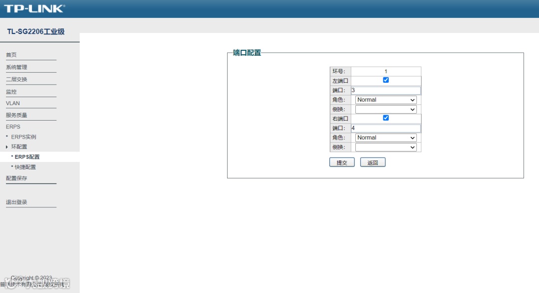 点击上图中红框标出的<端口>,进入左右端口配置,将端口1设置为RPL Owner,将端口2设置为Normal,如下图所示: