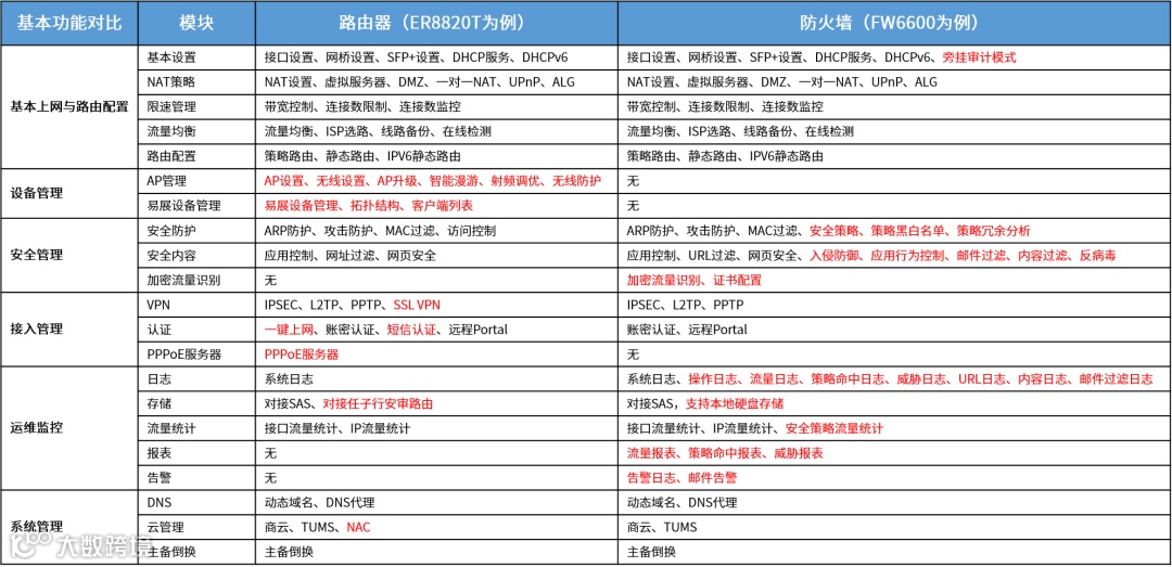 在产品功能上,路由器和防火墙也存在着差异,如防火墙提供完善的安全防护机制和安全审计策略,支持入侵防御、反病毒、文件过滤、URL过滤、应用识别,可拓展一体化DPI深度安全,适用于需要对网络流量进行深度安全检查的场景。