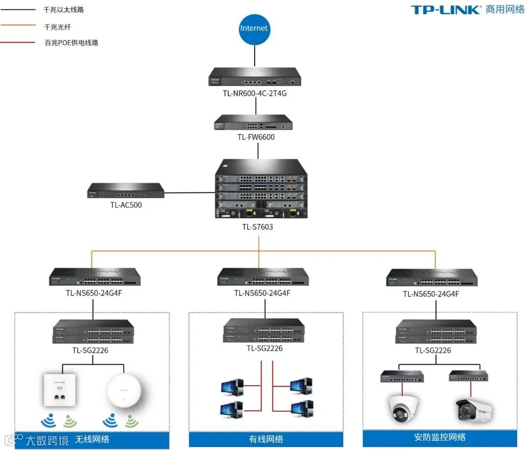 同时,有线网络中有线网络、无线网络、监控系统等同样业务分离,确保各业务分离,并行运行;