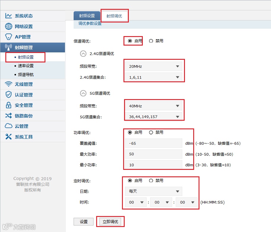 当然,为了获取良好的无线网络体验,往往需要进行无线优化,新版本AC支持丰富的无线网络优化功能:如负载均衡、智能漫游、频谱导航、射频调优等,一键优化您的网络,最常用也是最推荐的就是一键射频调优:
