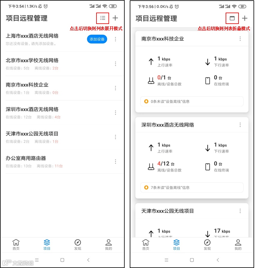 原版本的项目列表每个条目板块的展示界面过大,在有多个项目的情况下阅览很不方便,为此优化了项目列表支持折叠功能,即使有个多项目也可以一目了然的查看其在线/离线设备的实时状态。