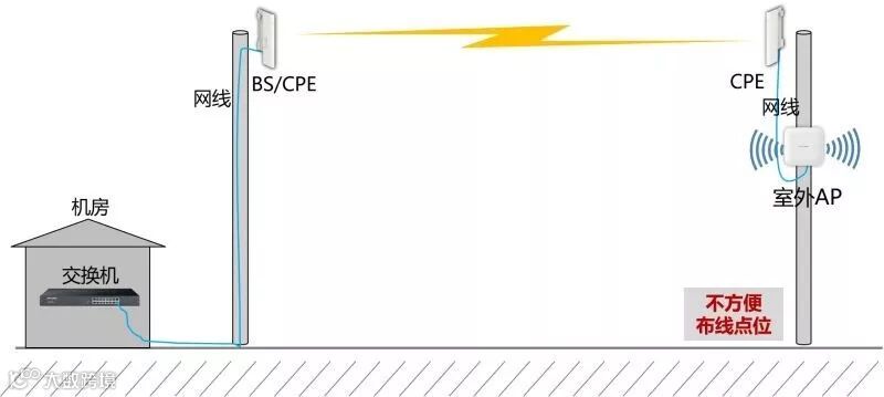 如果遇到不方便拉光纤或者布点的地方,建议使用无线网桥来进行网络传输。无线网桥相当于替代了埋在地下的光纤线路,对于部分无法/不便施工的点位,非常的方便、经济。