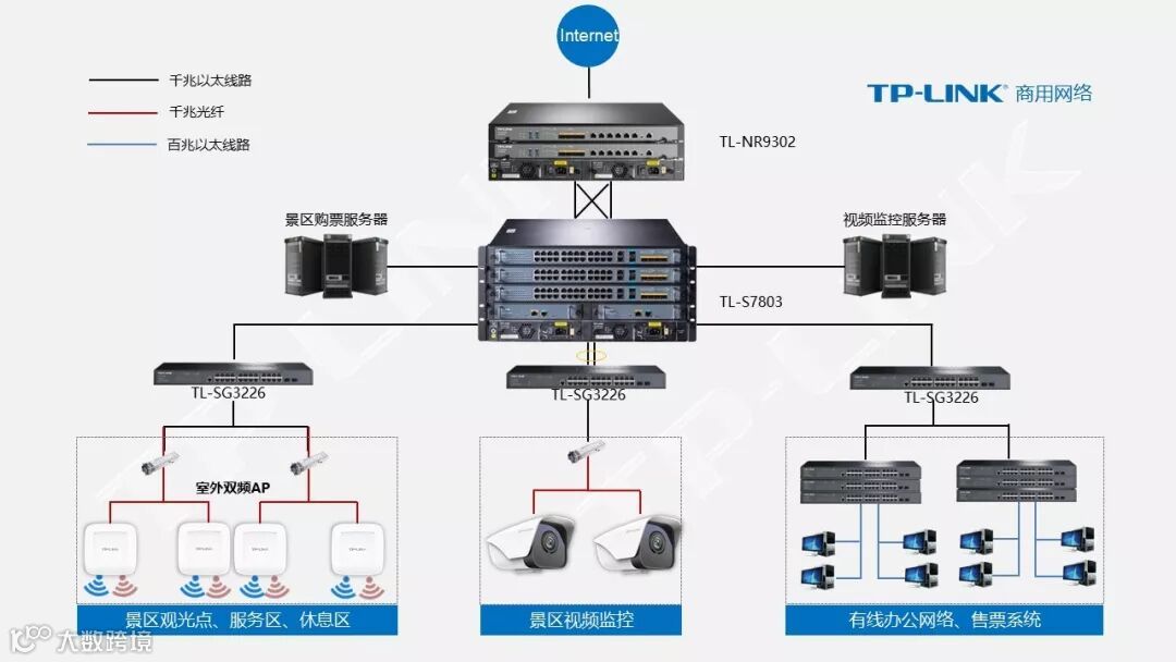 1、组网需求涉及到多种重要业务,包括售票、游客上网、监控数据传输,所以核心网络选择具备高稳定性、高性能的框式路由器TL-NR9302和框式交换机TL-S7803;
