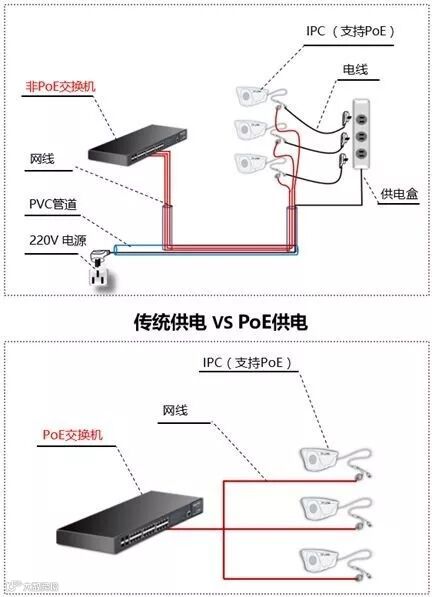 PoE就是通过网线进行供电和数据传输的一种技术,只需要一条网线就可以接入一个PoE摄像机点位,不需要额外的布线,而且相比传统的交流、12V直流集中供电都更安全可靠,。
