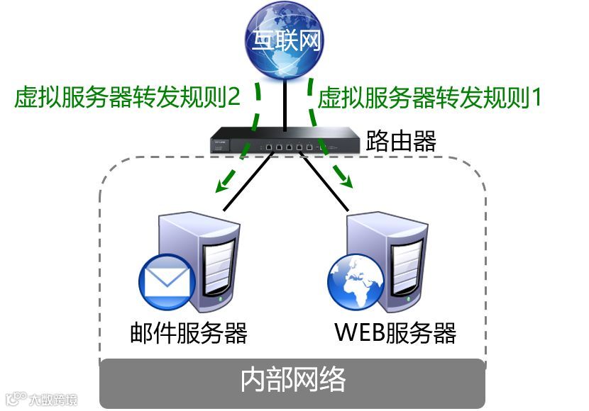 如何才能使外网访问内网搭建的各种服务器,实现信息、资源的共享?这就需要在路由器上进行虚拟服务器映射,将外网访问内网指定端口的数据转发到正确的计算机上,从而实现访问内网的各种服务器。
