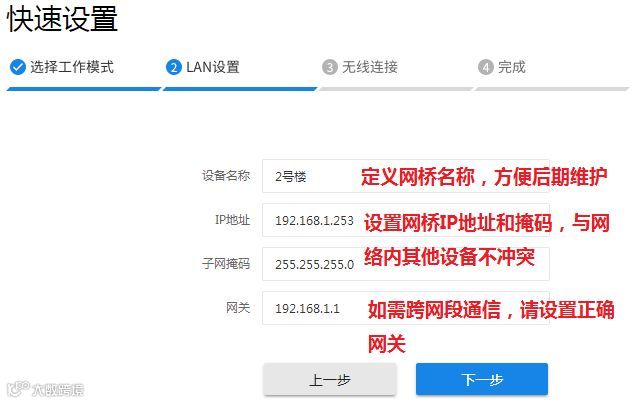设置无线网桥自身的设备名称和IP地址等网络参数。设置完毕,点击下一步。
