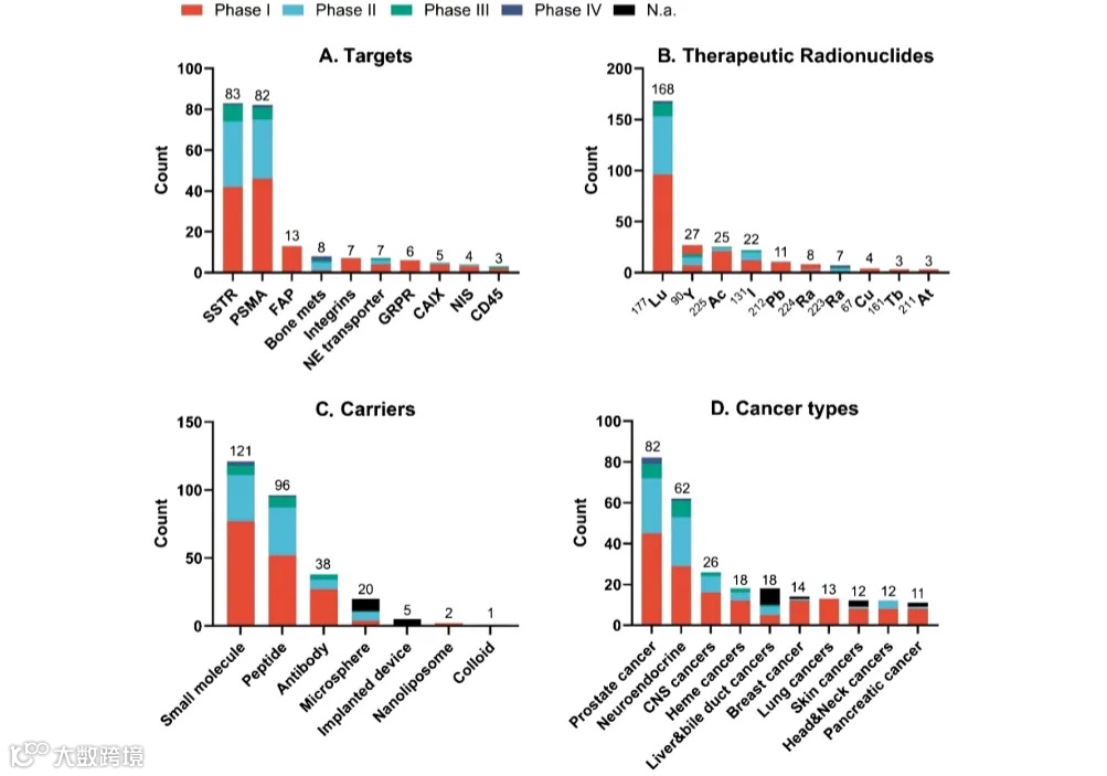 从核素种类看,177Lu和68Ga的管线占比超过60%,其次是18F(19%)、99mTc(8%)等。α射线的粒子与β射线相比质量更大,因此具有更高的效力和更短的射程,显示出在靶点附近表现出更强的癌细胞破坏性,与此同时α核素对附近其他健康组织和器官的有害辐射剂量较低,因此针对α核素开发的疗法占比有望逐渐提升。